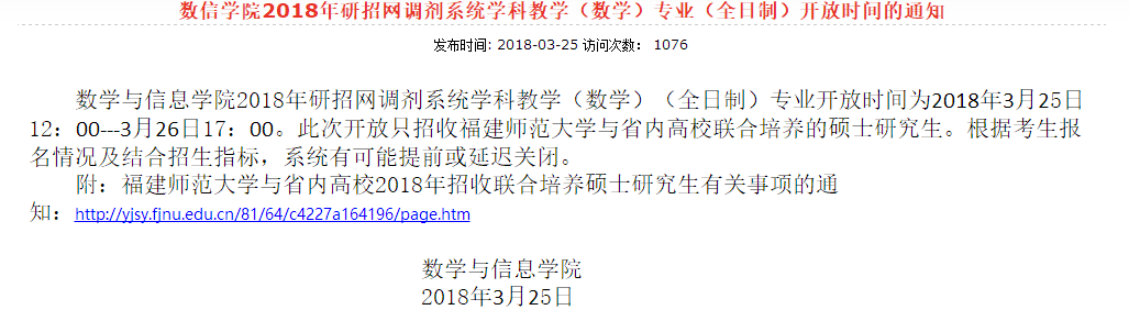 以上是聚创考研网为考生整理的"福建师范大学数学与信息学院2018年研招网调剂系统开放时间公告、数学全日制调剂开放公告"的相关考研信息,希望对大家考研备考有所帮助!