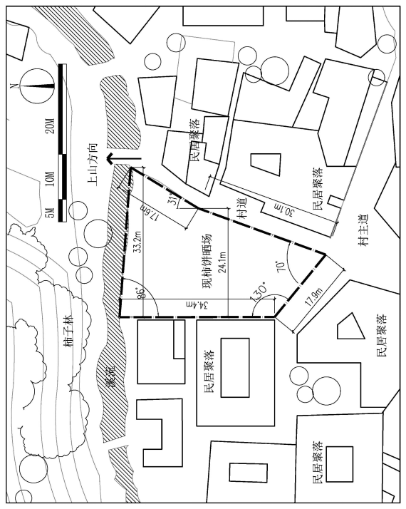 基地选取于村道一侧,基地面积约930平方米,基地北隔溪流为柿子林,其他方向均为民居聚落(详见附图)。基地现状为柿饼晒场,同时也是村民主要的活动场地,新建访客接待中心应充分保留原场地功能。访客车辆另行安排场地,本设计无需考虑。