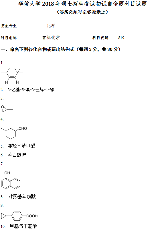 据悉,2018年华侨大学硕士研究生入学考试真题:819有机化学真题已公布,聚英华侨大学考研网小编为你整理如下内容: