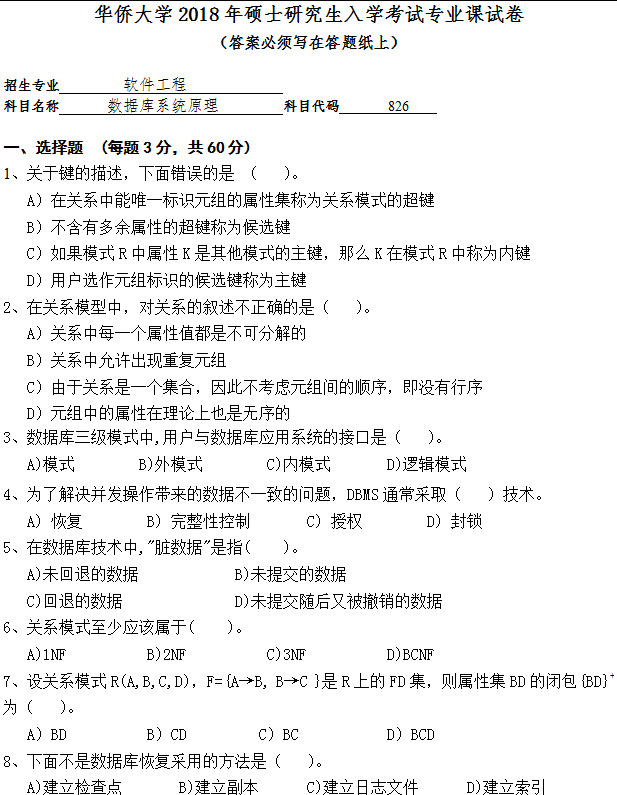 热门关键词:华侨大学硕士研究生考试真题 计算机科学学院 软件工程专业 数据库系统原理真题