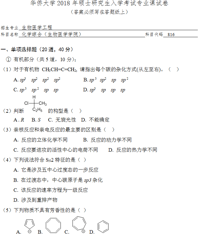 据悉,2018年华侨大学硕士研究生入学考试真题:816化学综合真题已公布,聚英华侨大学考研网小编为你整理如下内容: