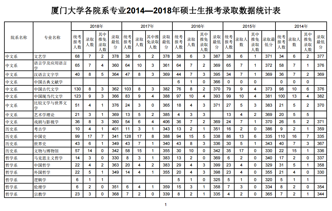 完整版内容请查看附件:厦门大学各院系专业 2014 ~ 2018年 硕士生报考录取数据统计表