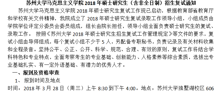 据悉,苏州大学马克思主义学院2018年硕士研究生(含非全日制)招生复试通知已公布, 聚英苏州大学考研网小编为大家整理内容如下: