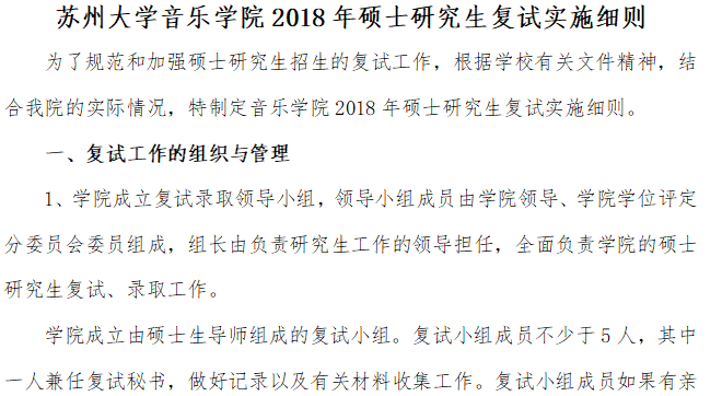 据悉,2018年苏州大学音乐学院硕士研究生复试实施细则已经公布,聚英苏州大学考研网为您整理如下: