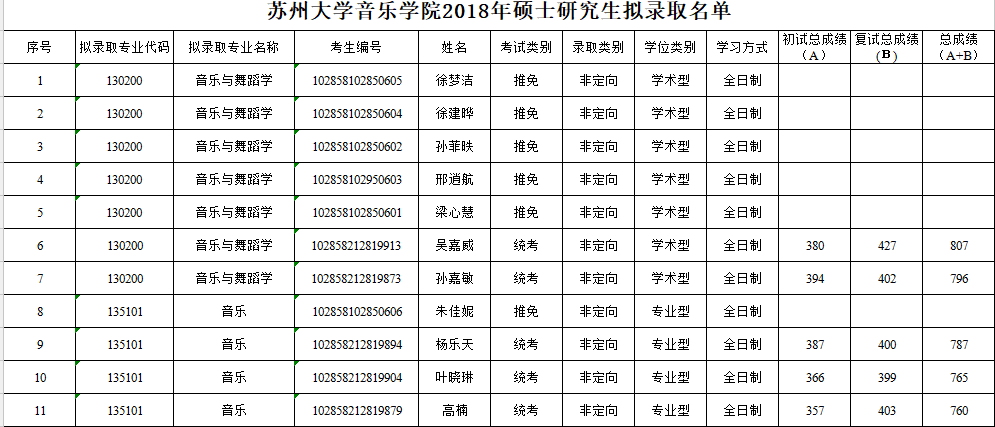 据悉,2018年苏州大学音乐学院硕士研究生拟录取名单已经公布,聚英苏州大学考研网为您整理如下: