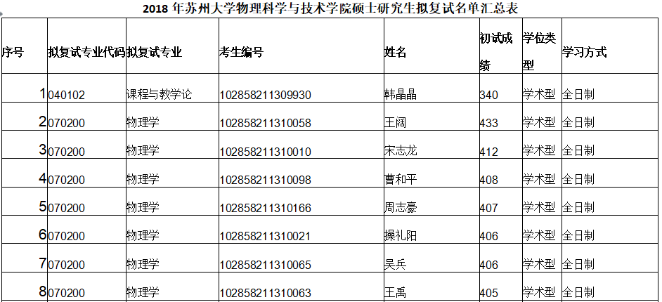 据悉,2018年苏州大学物理科学与技术学院硕士研究生拟复试名单汇总表已经公布,聚英苏州大学考研网为您整理如下:
