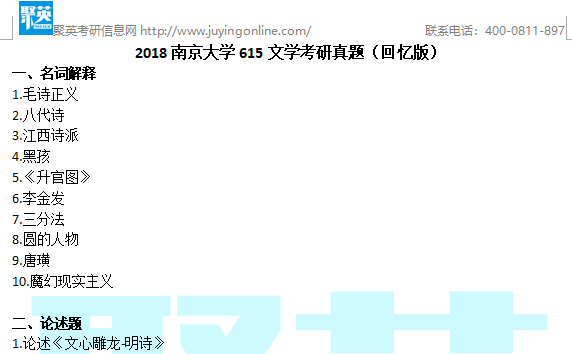 以上是聚创考研网为考生整理的"2018南京大学615文学考研真题(回忆版)"的相关考研信息,希望对大家考研备考有所帮助! 备考过程中如有疑问,也可以添加老师微信juchuang911进行咨询。