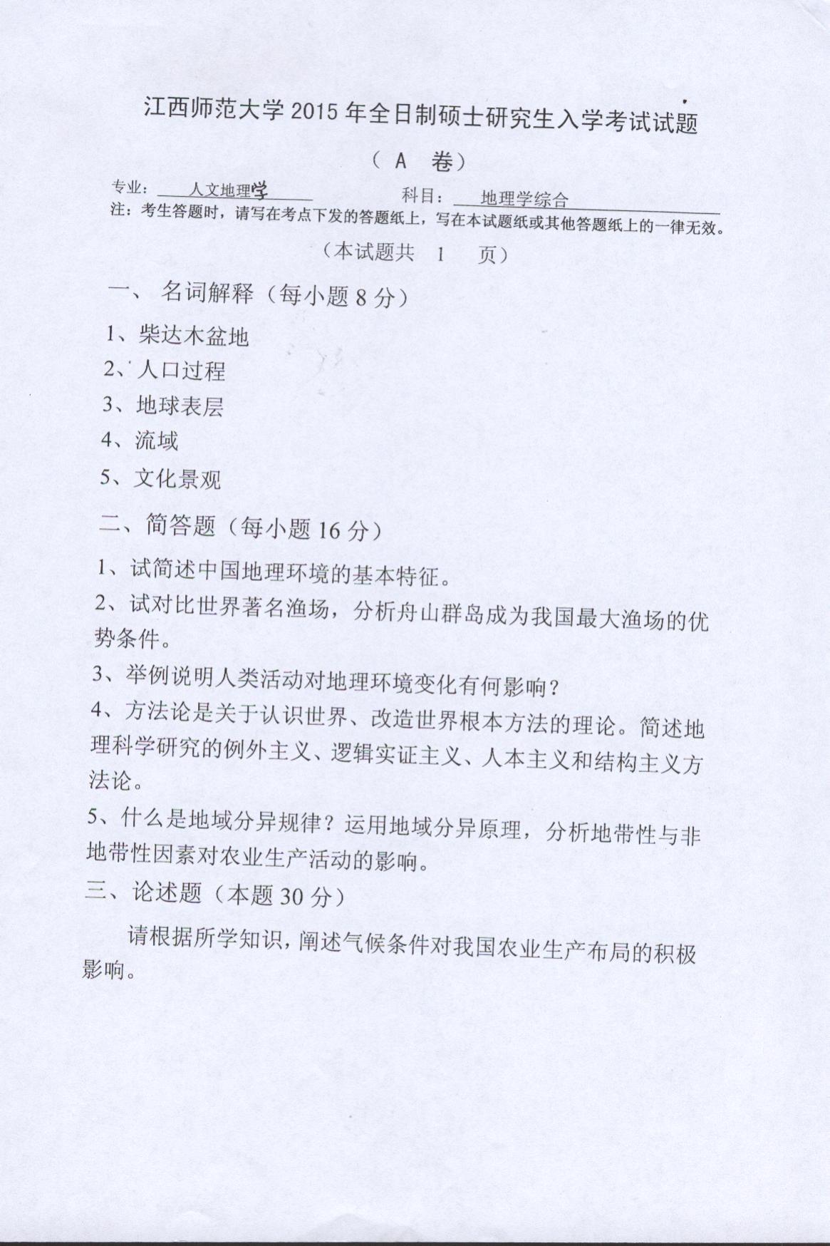 据悉,2015年江西师范大学人文地理学专业硕士研究生考试真题:856地理学综合已公布,聚英江西师范大学考研网小编为你整理如下内容: