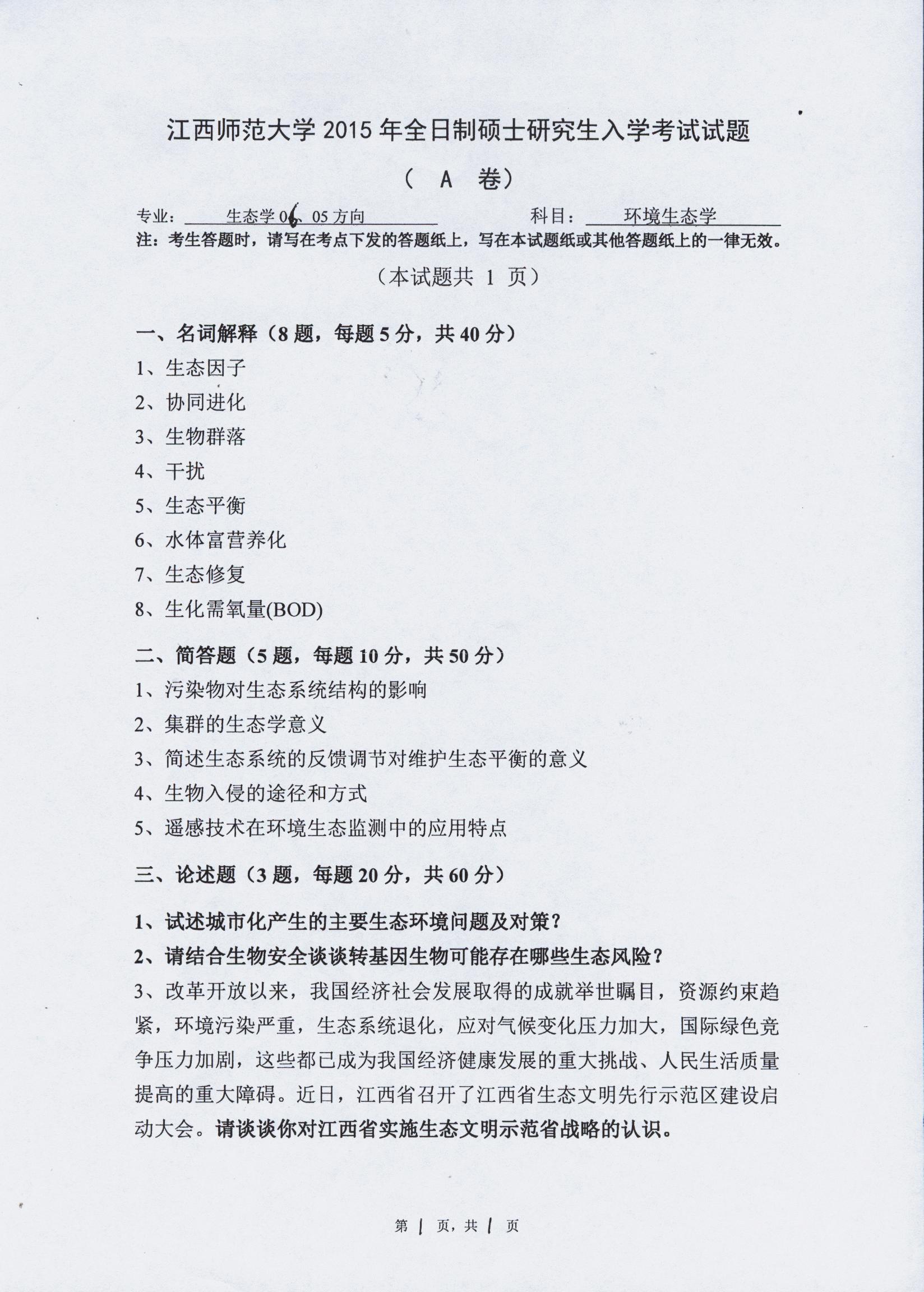 据悉,2015年江西师范大学生态学专业硕士研究生考试真题:859环境生态学已公布,聚英江西师范大学考研网小编为你整理如下内容: