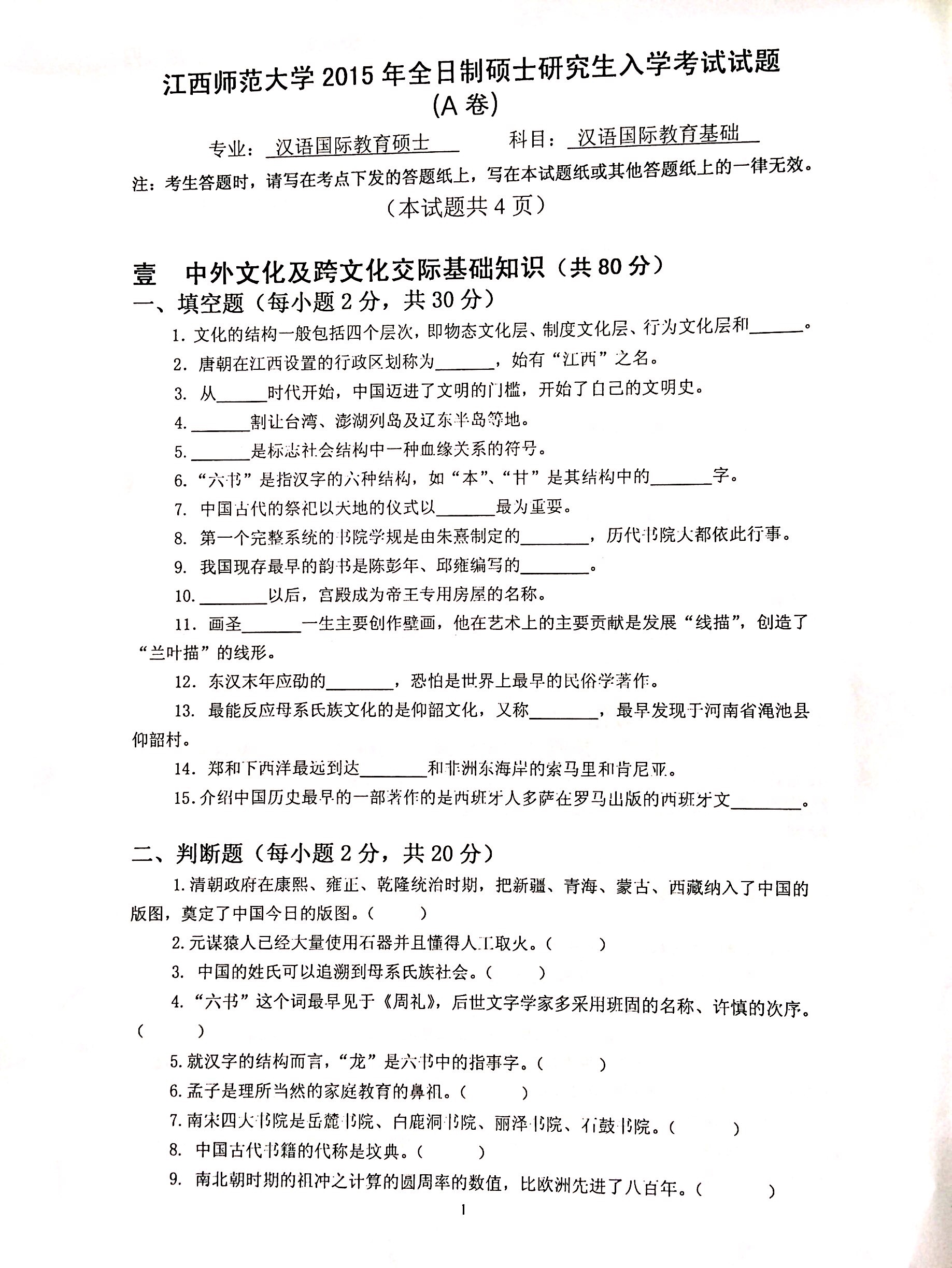 据悉,2015年江西师范大学445汉语国际教育基础硕士研究生考试真题已公布,聚英江西师范大学考研网小编为你整理如下内容: