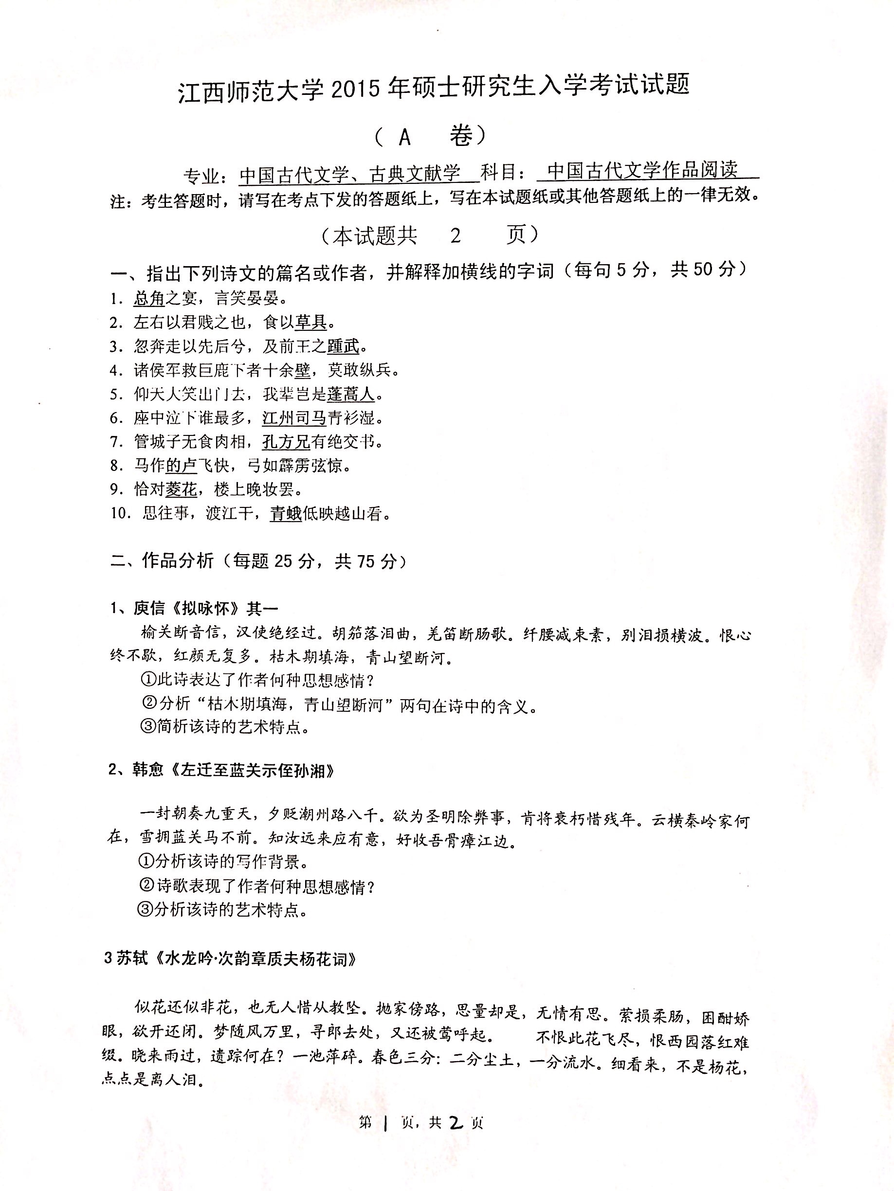 以上是聚创考研网为考生整理的"2015年江西师范大学714中国古代文学作品阅读硕士研究生考试真题"的相关考研信息,希望对大家考研备考有所帮助! 备考过程中如有疑问,也可以添加老师微信juchuang911进行咨询。