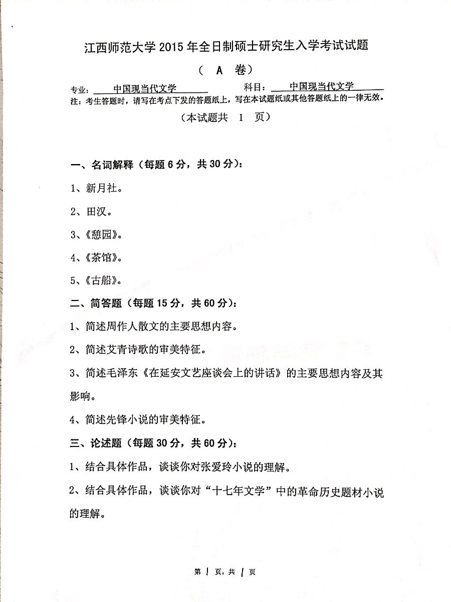 以上是聚创考研网为考生整理的"2015年江西师范大学840中国现当代文学硕士研究生考试真题"的相关考研信息,希望对大家考研备考有所帮助! 备考过程中如有疑问,也可以添加老师微信juchuang911进行咨询。