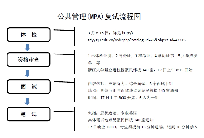 要求:上线MPA考生需先体检,然后进行资格审查、复试。体检地点限浙大校医院。