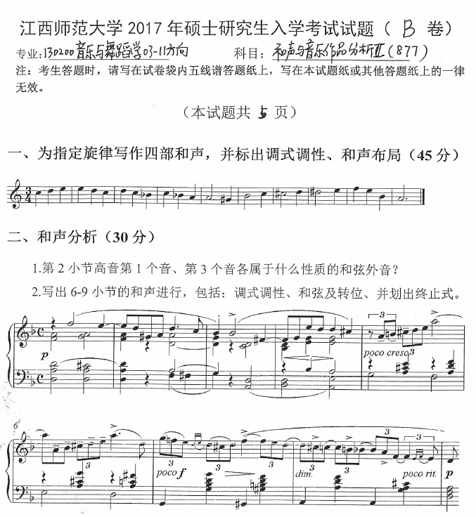 据悉,2017年江西师范大学877和声与音乐作品分析II硕士研究生考试真题已公布,聚英江西师范大学考研网小编为你整理如下内容:
