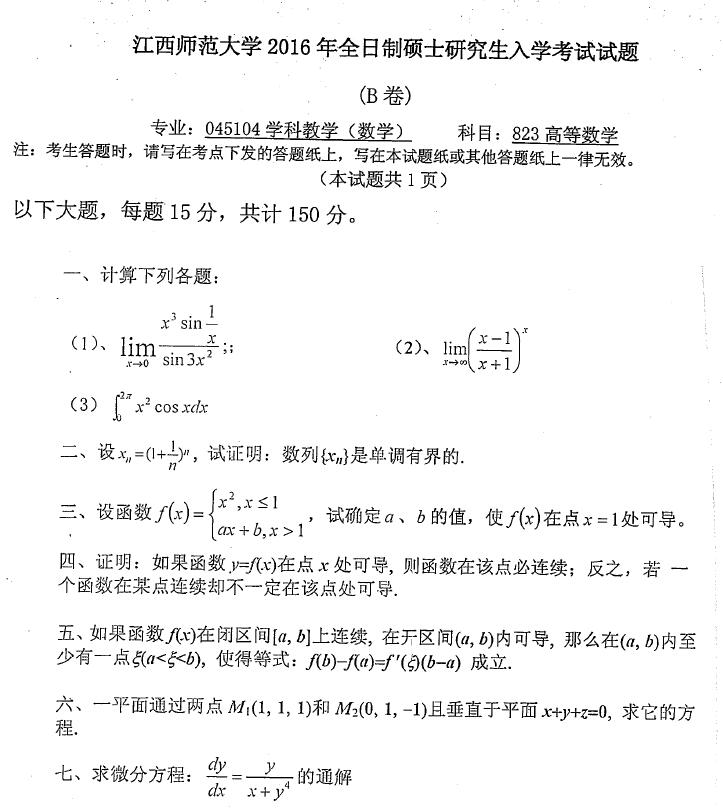 据悉,2016年江西师范大学823高等数学硕士研究生考试真题已公布,聚英江西师范大学考研网小编为你整理如下内容: