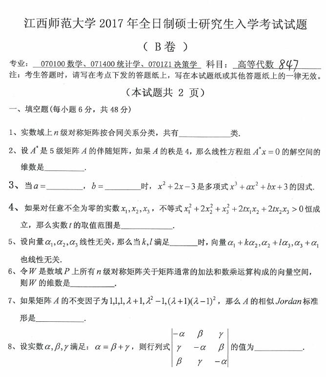 据悉,2017年江西师范大学847高等代数硕士研究生考试真题已公布,聚英江西师范大学考研网小编为你整理如下内容: