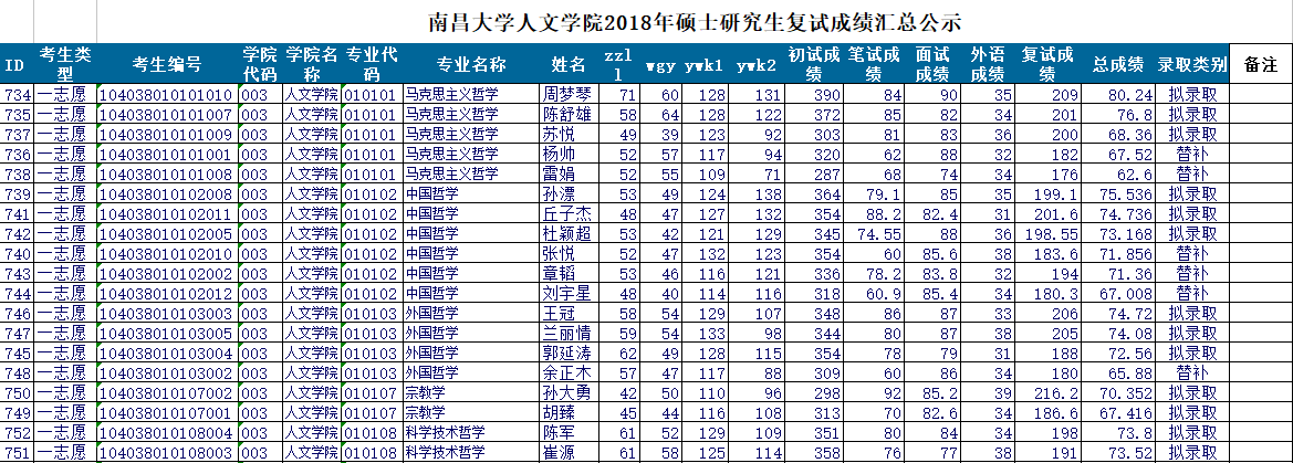 据悉南昌大学人文学院2018年硕士研究生复试成绩汇总表公示已公布,聚英南昌大学考研网小编为你整理如下内容: