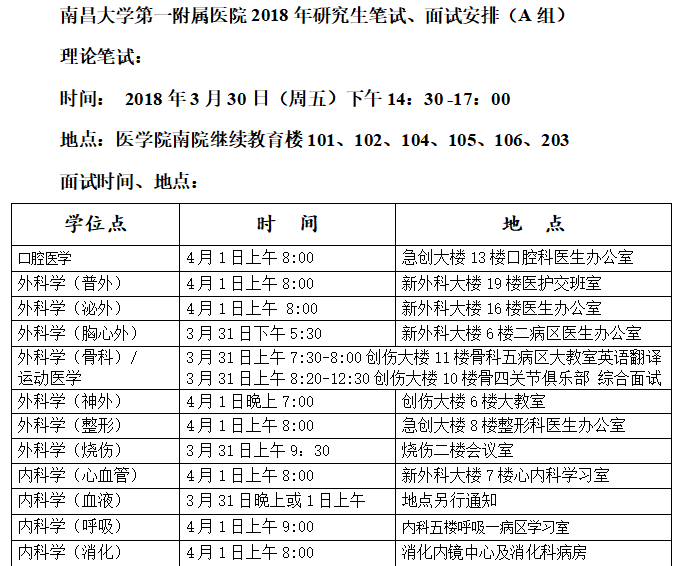 1.2018年南昌大学医学院硕士研究生专业复试时间、地点安排表(A组).doc