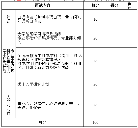 (2)综合面试:每位考生不少于20分钟,满分100分。考生介绍本科专业、科研经历、研究生学习及研究兴趣等。导师组通过提问重点考查考生的基本素养、学术能力、学术志趣、研究潜力、学术研究计划等。面试成绩不合格考生不得进入最后录取名单。