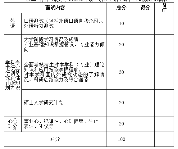 表二 材料与能源学部2018年硕士研究生招生综合面试成绩记载表