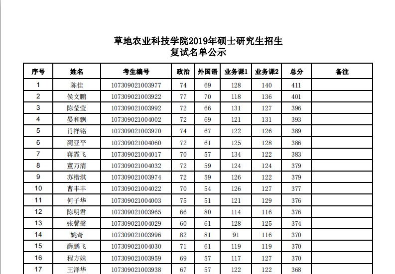 附件:草地农业科技学院2019年硕士研究生招生第一志愿复试名单公示