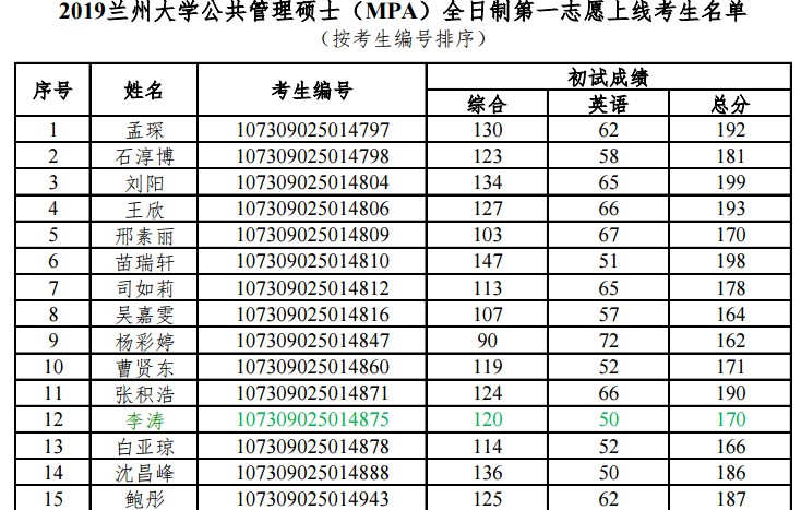 附件1:2019兰州大学公共管理硕士(MPA)全日制第一志愿上线考生名单