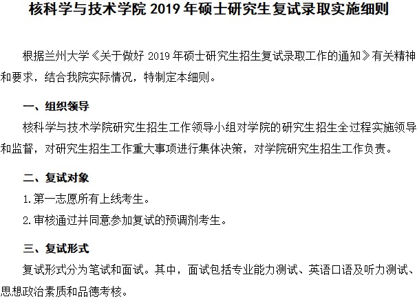 以上是聚创考研网为考生整理的"兰州大学核科学与技术学院2019年硕士研究生复试录取实施细则"的相关考研信息,希望对大家考研备考有所帮助! 备考过程中如有疑问,也可以添加老师微信juchuang911进行咨询。
