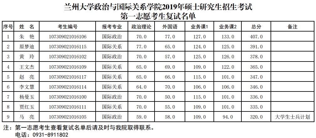 据悉,兰州大学政治与国际关系学院2019年硕士研究生招生考试第一志愿考生复试名单已公布,聚英兰州大学考研网小编为你整理如下内容: