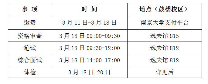 根据教育部《2019年全国硕士研究生招生工作管理规定》和《南京大学二〇一九年硕士研究生复试录取工作意见》的具体要求,坚持按需招生、德智体全面衡量、保证质量、择优录取、宁缺毋滥的原则,开展我院2019年硕士研究生招生复试工作,具体安排如下: