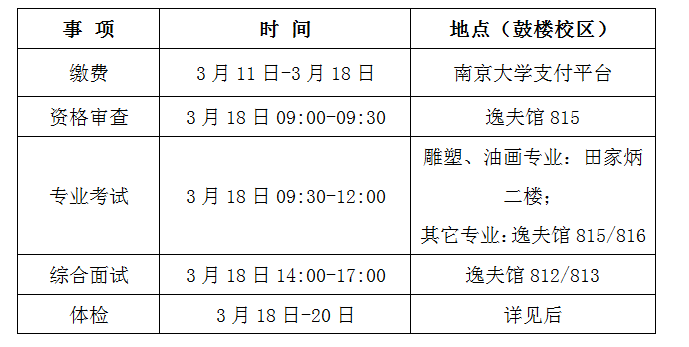 C.体检:体检工作由校医院组织。①3月18日—20日,上午8:00—11:30;地点:南京大学鼓楼校区校医院(南京市汉口路22号、南京大学正大门东侧50米)。②3月21日-22日,上午8:00—11:30;地点:南京大学仙林校区校医院。体检前一天饮食须清淡,体检当日须空腹,并携带身份证、近期正面免冠一寸照片一张及86元(微信支付)。体检工作可以在3月15日开始在电脑上提前预约(网址:http://hospital.nju.edu.cn:8080,登录名为LS(须大写)+考生编号的最后7位数字,密码为身份证号,只能通过电脑预约,须用IE9以上浏览器)。因特殊原因需要调整体检时间的考生可直接与南京大学医院防保科联系(025-83592347转8118)。
