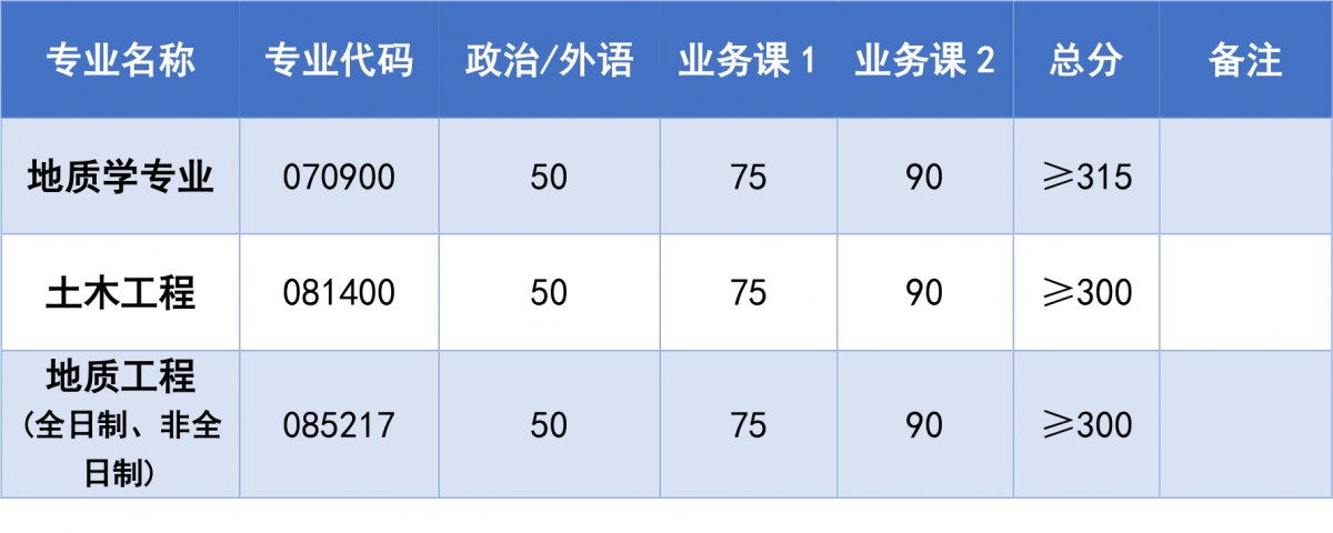 2.原则上按照各招生学科专业总成绩从高分到低分依次确定拟录取名单,我院按地质学、土木工程(岩土工程)、地质工程(专业学位)全日制、地质工程(专业学位)非全日制,学科专业分别确定录取名单。