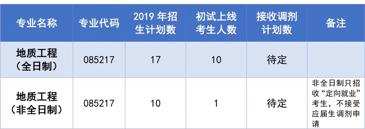 调剂录取原则:调剂考生总成绩单独排列,按照调剂考生的总分(初始成绩+复试成绩)从高分到低分依次确定拟录取名单。地质工程专业学位(非全日制)不接受应届生毕业生调剂。