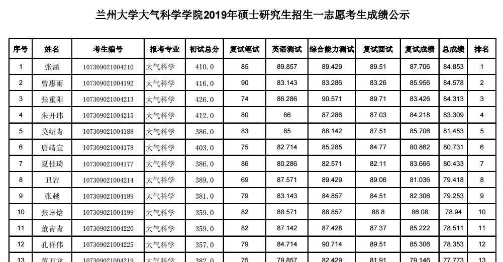附件:兰州大学大气科学学院2019年硕士研究生招生一志愿考生成绩公示