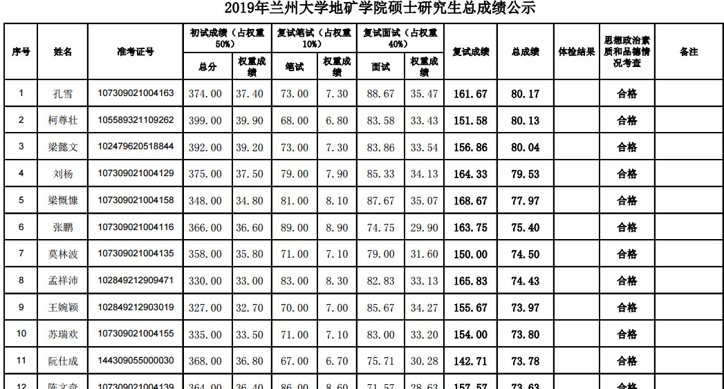附件:2019年兰州大学地矿学院硕士研究生总成绩公示