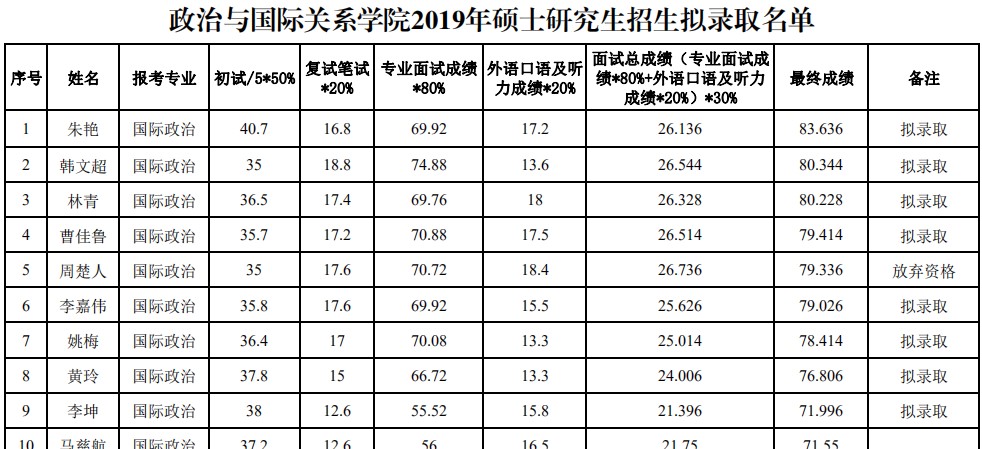 以上是聚创考研网为考生整理的"兰州大学政治与国际关系学院2019年硕士研究生招生拟录取名单"的相关考研信息,希望对大家考研备考有所帮助! 备考过程中如有疑问,也可以添加老师微信juchuang911进行咨询。