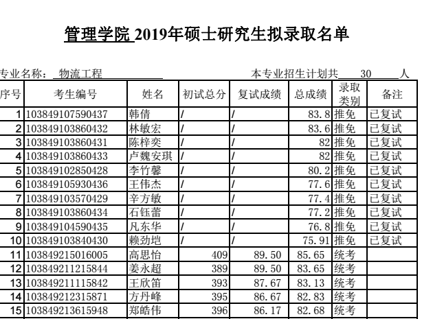 厦门大学管理学院2019年全日制物流工程硕士生拟录取名单
