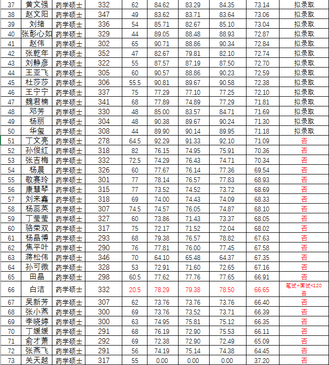 3、此表仅显示根据复试成绩排名情况,在考生体检结果、思政考核合格的情况下,学院根据招生计划,按照成绩由高到低的顺序向学校上报拟录取名单。最终拟录取结果以研究生院审核最终公布为准。