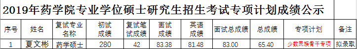 1、2019年药学院研究生招生考试药学硕士(专业学位)经过初试、复试,现已圆满结束。考试成绩公示如下,如无异议将上报研究生院作为审核后确定最终拟录取结果。如有疑问请联系0931-8915686,jlxu@lzu.edu.cn。