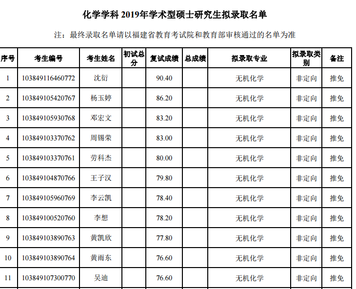 完整版请查看:厦门大学化学系2019年硕士生拟录取名单公示.pdf