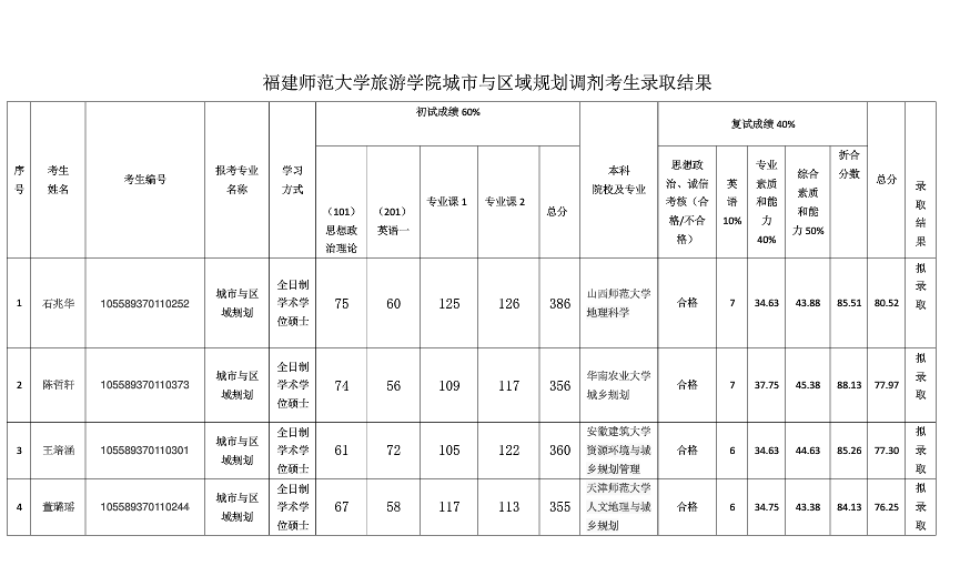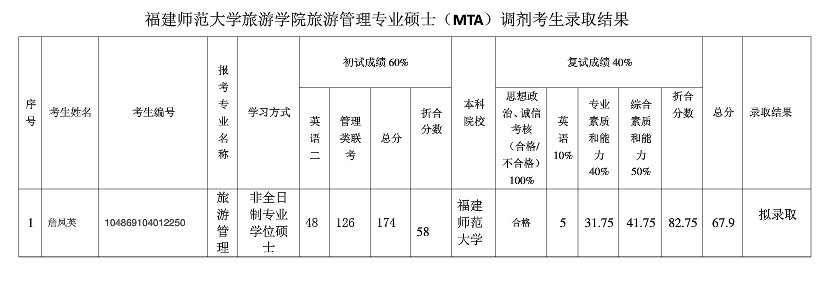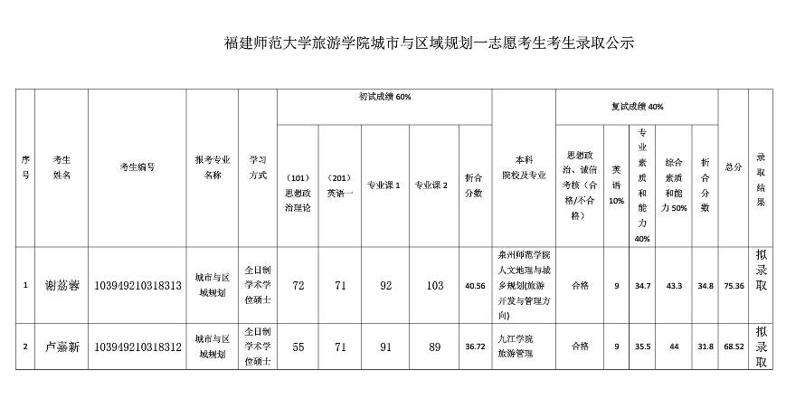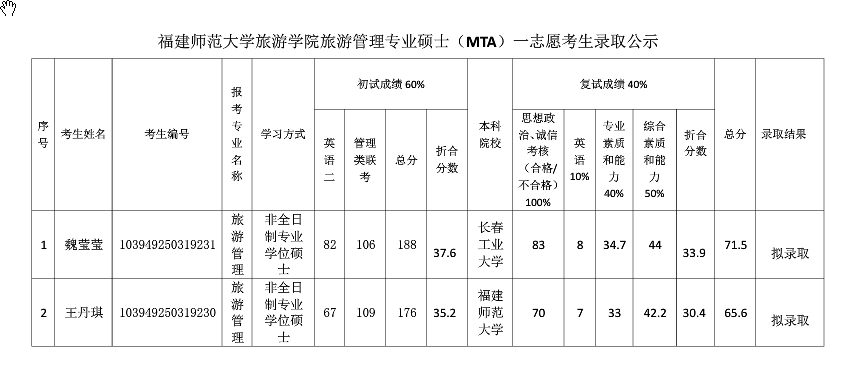 据悉,福建师范大学2019年旅游学院一志愿考生、调剂生拟录取名单公示已公布,聚创福建师范大学考研网小编为你整理如下内容: