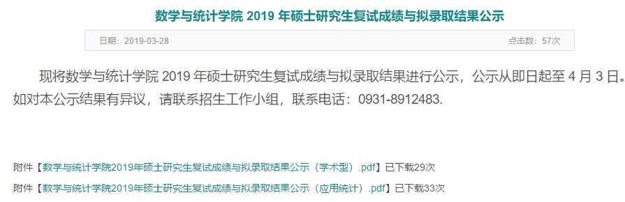 据悉,兰州大学数学与统计学院2019年硕士研究生复试成绩与拟录取结果公示(学术型,应用统计)已公布,聚创兰州大学考研网小编为你整理如下内容: