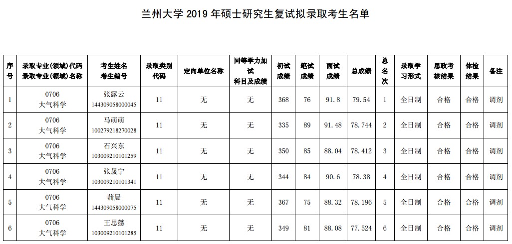 据悉,兰州大学大气科学学院2019年硕士研究生复试拟录取考生名单已公布,聚创兰州大学考研网小编为你整理如下内容: