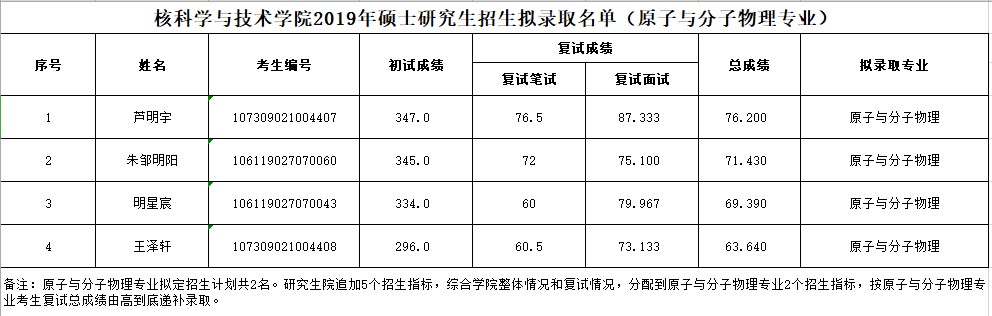 以上是聚创考研网为考生整理的"兰州大学2019年核科学与技术学院原子与分子物理专业招生拟录取结果名单"的相关考研信息,希望对大家考研备考有所帮助!
