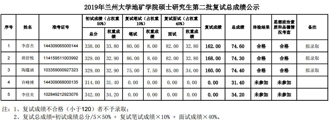 以上是聚创考研网为考生整理的"2019年兰州大学地质科学与矿产资源学院硕士研究生第二批复试总成绩名单"的相关考研信息,希望对大家考研备考有所帮助!