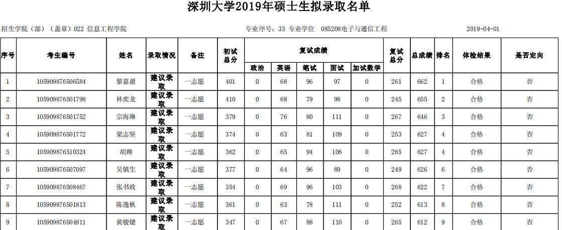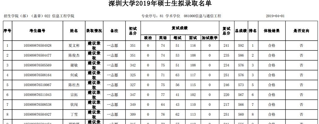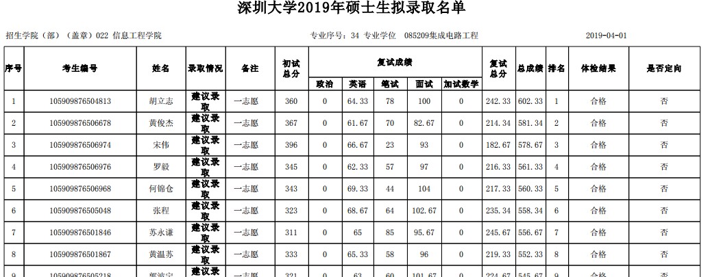 据悉,2019年深圳大学信息工程学院三种专业硕士研究生拟录取名单统计已公布,聚创深圳大学考研网小编为你整理如下内容:
