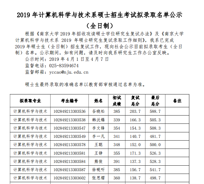 完整版请查看附件:2019年计算机科学与技术系硕士招生考试拟录取名单公示(全日制).pdf