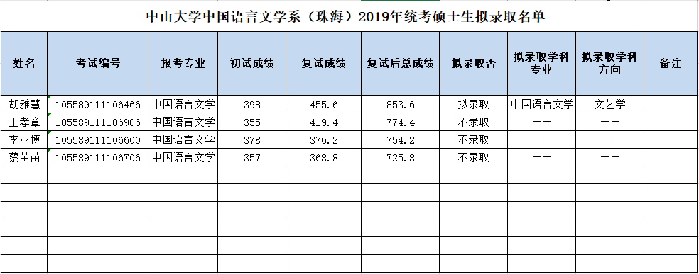 以上是聚创考研网为考生整理的"中山大学中国语言文学系(珠海)2019年统考硕士生拟录取名单"的相关考研信息,希望对大家考研备考有所帮助!