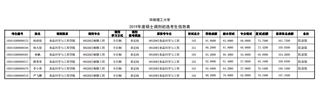 聚创华南理工大学考研网快讯,华南理工大学食品科学与工程学院2019年硕士研究生招生复试制糖工程调剂复试成绩,详情如下: