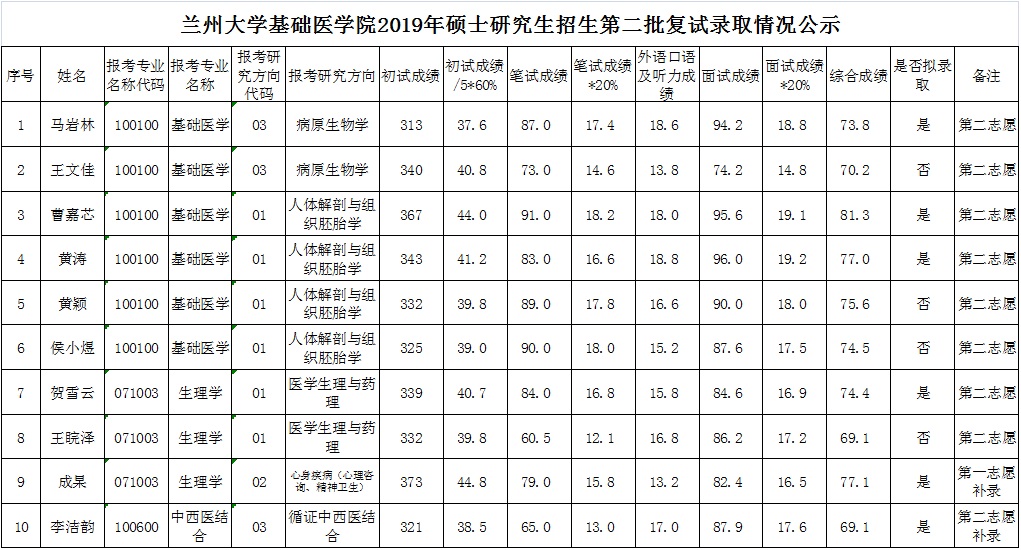 据悉,兰州大学基础医学院2019年硕士招生第二批复试拟录取名单已公布,聚创兰州大学考研网小编为你整理如下内容: