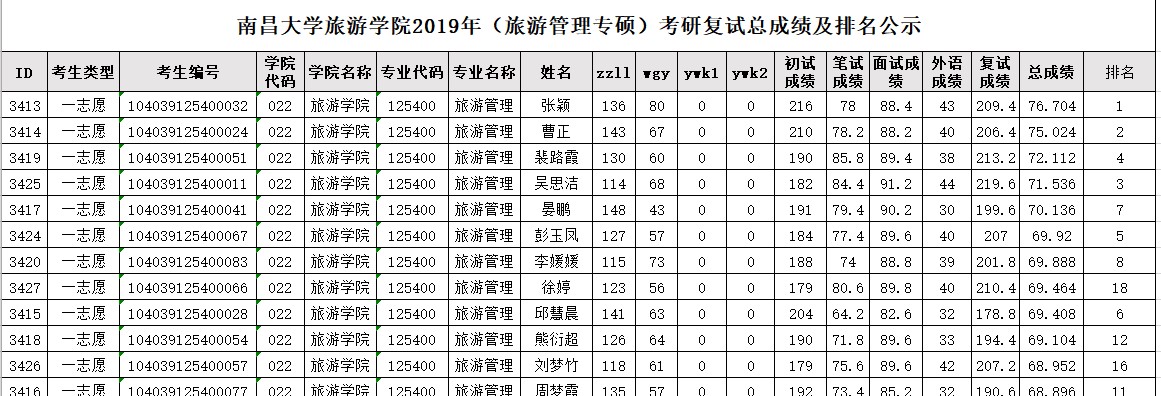 附件:南昌大学旅游学院2019年(旅游管理专硕)复试总成绩及排名公示